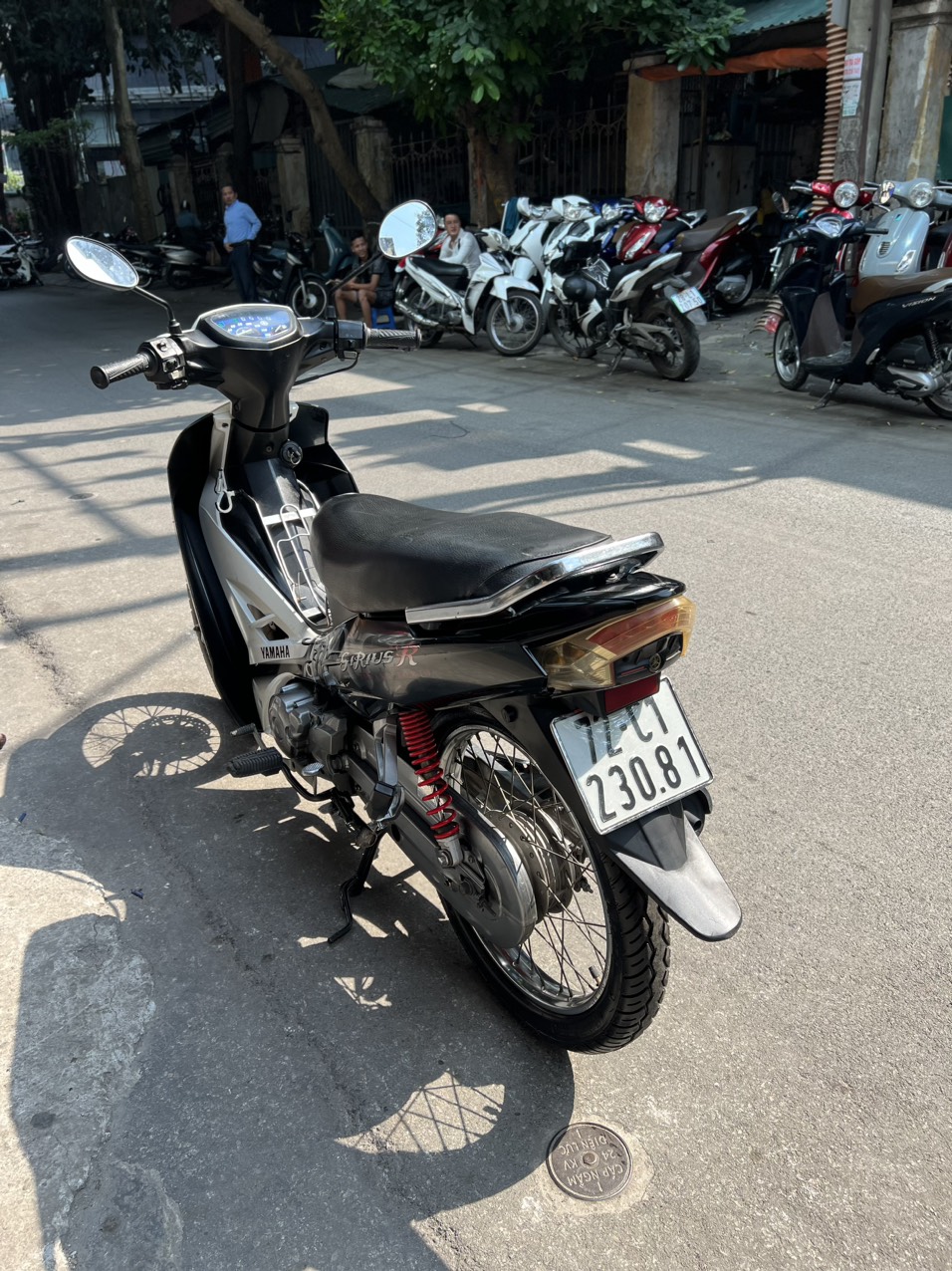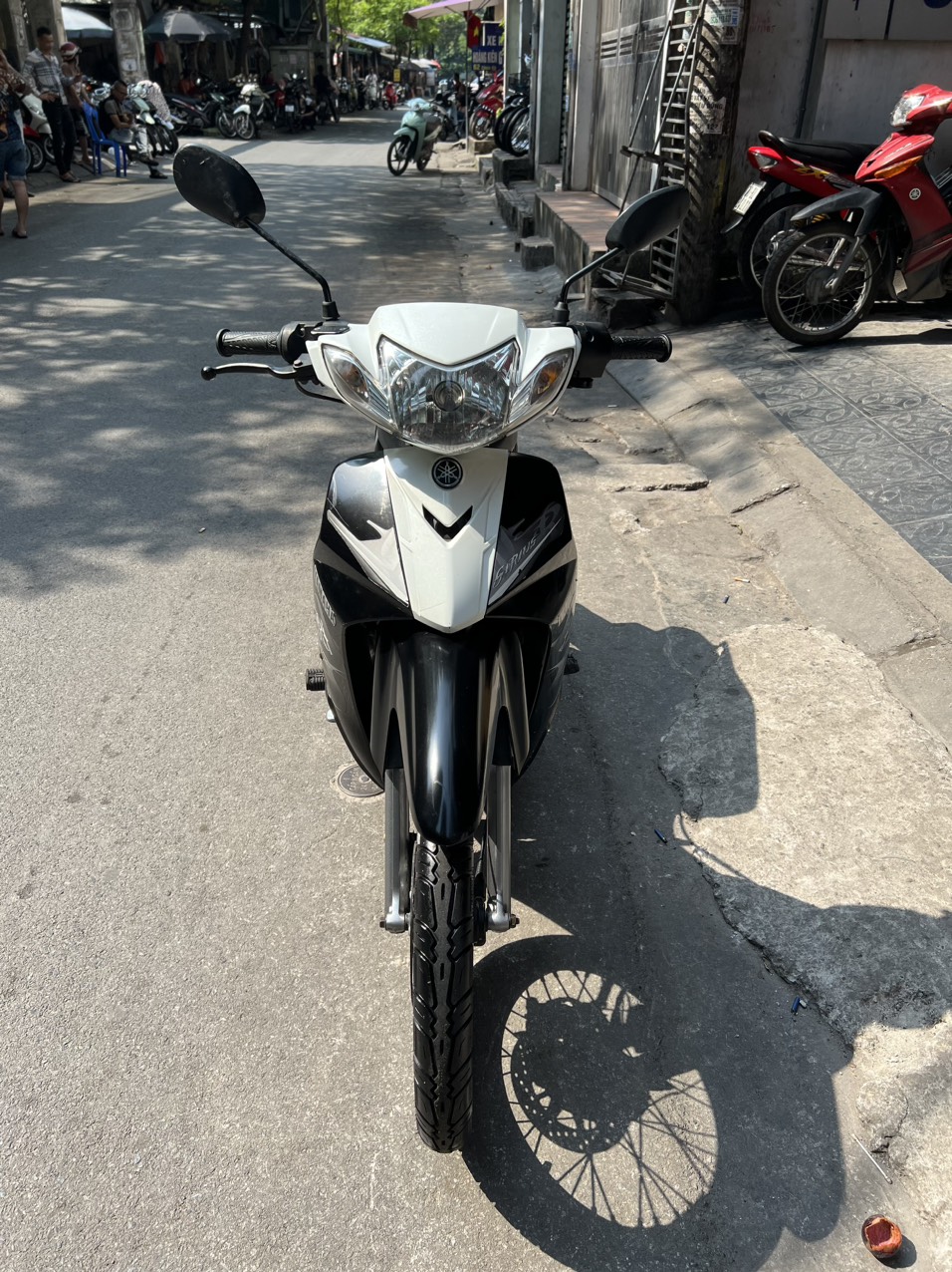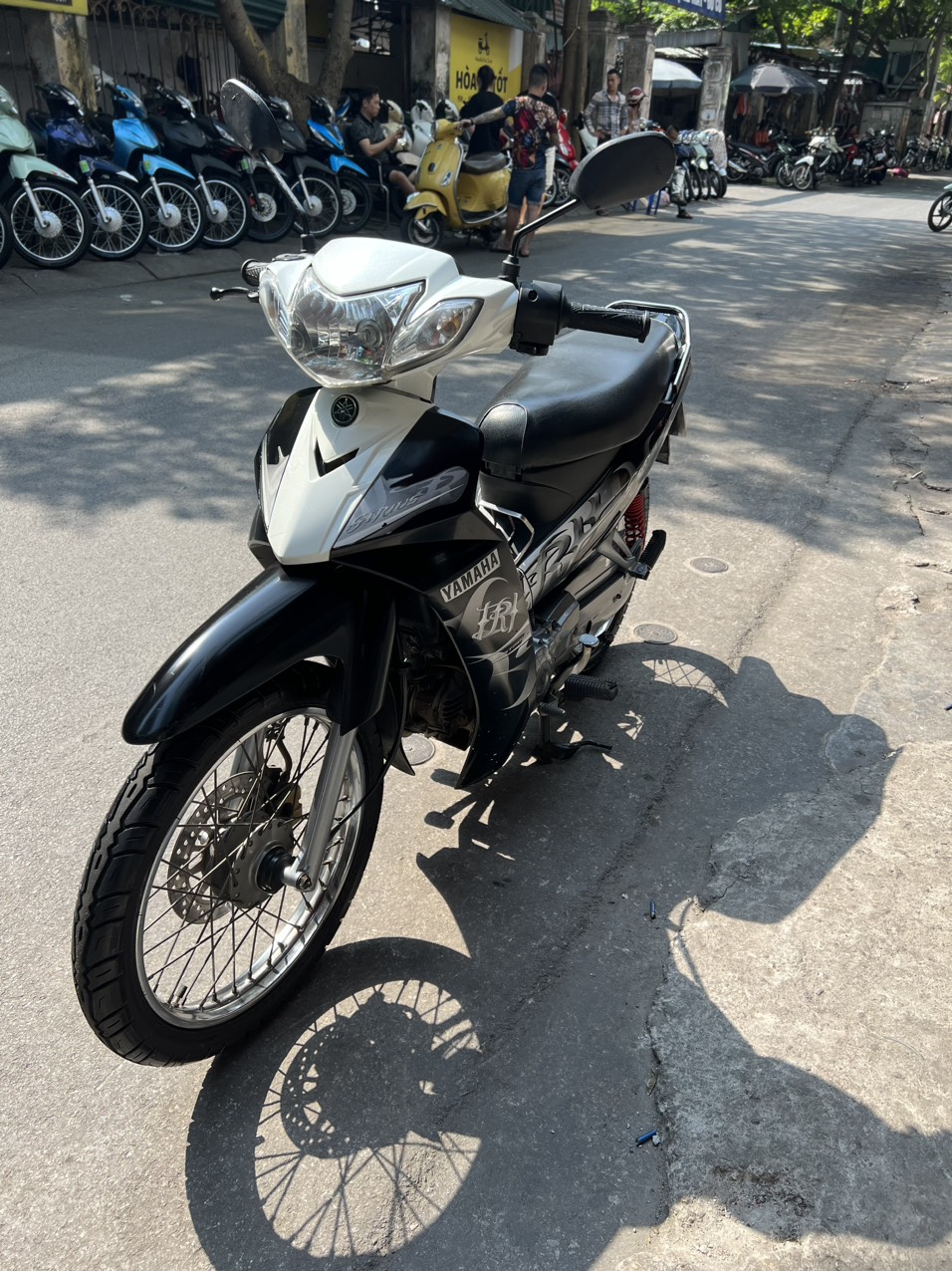 Yamaha Sirius, màu trắng đen, dung tích 110cc. Xe có hình thức đẹp, động cơ khởi động êm ái, sang số nhẹ nhàng, hoạt động mạnh mẽ, di chuyển ổn định ở tốc độ cao. Ngoài ra xe còn được yêu thích bởi tính bền bỉ, tiết kiệm nhiên liệu và rất ít khi hỏng vặt. Xe tỏ ra có ưu điểm vượt trội khi đi trong các ngõ nhỏ, phố nhỏ, đường đô thị chật hẹp, nhiều lối rẽ. Xe có thiết kế phun xăng điện tử, tiết kiệm nhiên liệu, xăng chạy tầm 2L/100km.