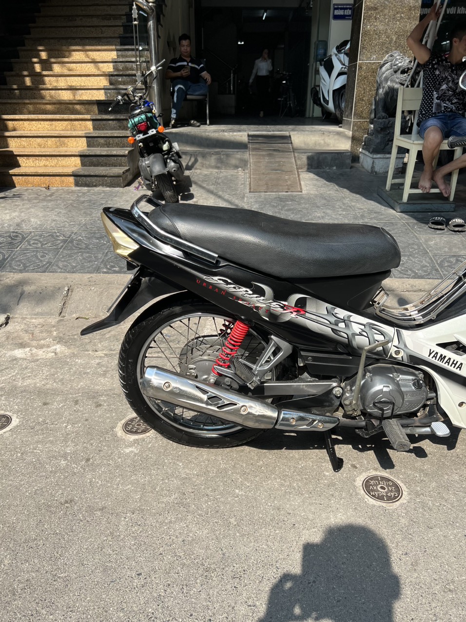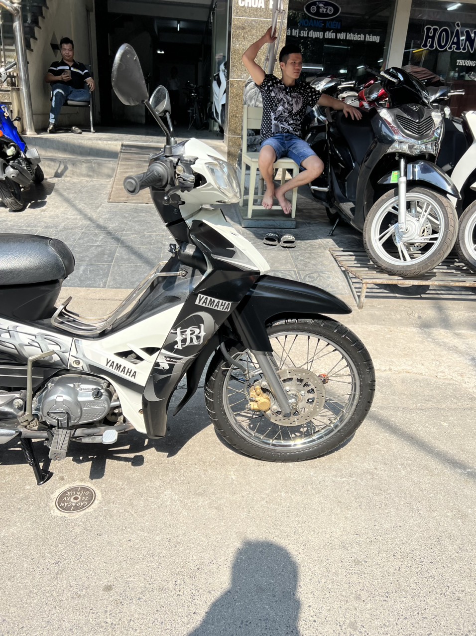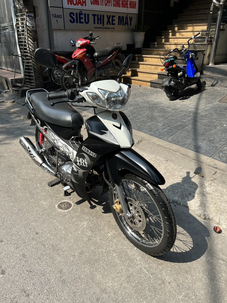 Yamaha Sirius, màu trắng đen, dung tích 110cc. Xe có hình thức đẹp, động cơ khởi động êm ái, sang số nhẹ nhàng, hoạt động mạnh mẽ, di chuyển ổn định ở tốc độ cao. Ngoài ra xe còn được yêu thích bởi tính bền bỉ, tiết kiệm nhiên liệu và rất ít khi hỏng vặt. Xe tỏ ra có ưu điểm vượt trội khi đi trong các ngõ nhỏ, phố nhỏ, đường đô thị chật hẹp, nhiều lối rẽ. Xe có thiết kế phun xăng điện tử, tiết kiệm nhiên liệu, xăng chạy tầm 2L/100km.