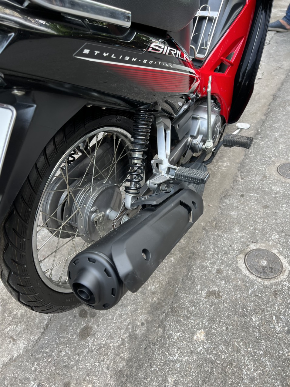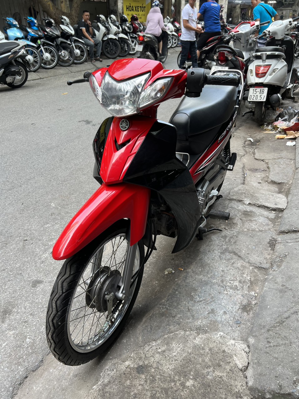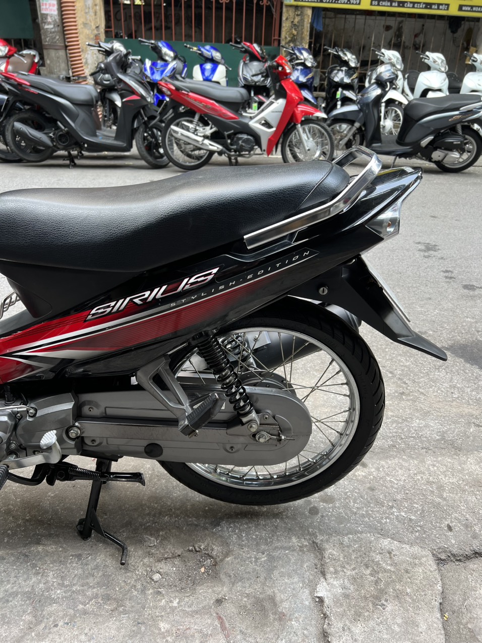 Yamaha Sirius, màu đỏ đen, dung tích 110cc. Xe có hình thức đẹp, động cơ khởi động êm ái, sang số nhẹ nhàng, hoạt động mạnh mẽ, di chuyển ổn định ở tốc độ cao. Ngoài ra xe còn được yêu thích bởi tính bền bỉ, tiết kiệm nhiên liệu và rất ít khi hỏng vặt. Xe tỏ ra có ưu điểm vượt trội khi đi trong các ngõ nhỏ, phố nhỏ, đường đô thị chật hẹp, nhiều lối rẽ. Xe có thiết kế phun xăng điện tử, tiết kiệm nhiên liệu, xăng chạy tầm 2L/100km.