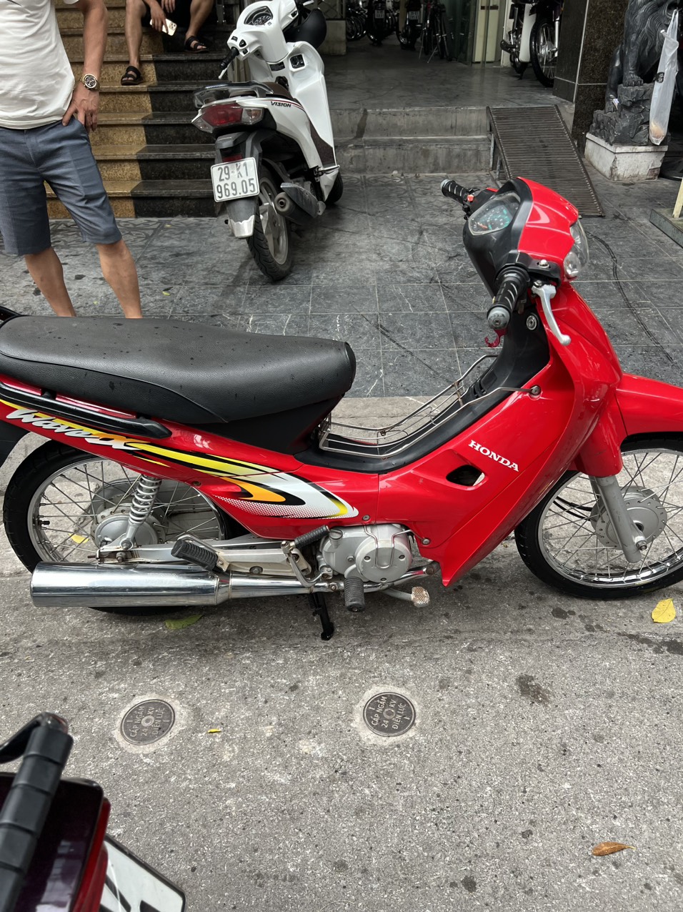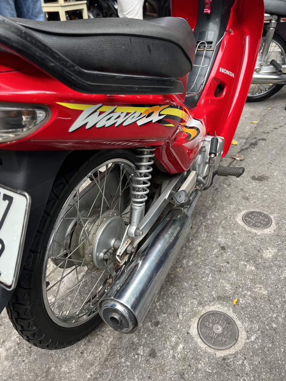 Honda Wave A, màu đỏ, dung tích 100cc. Xe có thiết kế nhỏ gọn, chắc chắn, đi đầm, máy êm, chạy bốc, di chuyển ổn định ở tốc độ cao. Ngoài ra xe còn được yêu thích bởi tính bền bỉ, tiết kiệm nhiên liệu và rất ít khi hỏng vặt. Xe tỏ ra có ưu điểm vượt trội khi đi trong các ngõ nhỏ, phố nhỏ, đường đô thị chật hẹp, nhiều lối rẽ.